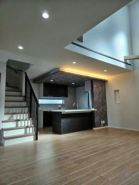 20帖のリビング上部には天窓、リーシングファン付の吹抜けを設置し、とても明るいリビングとなっています