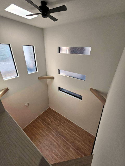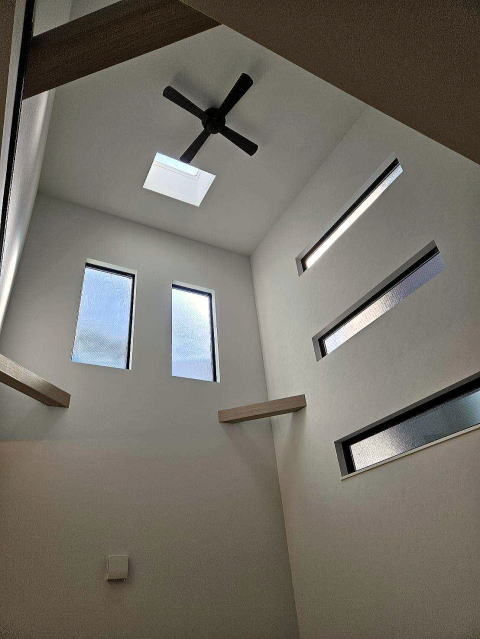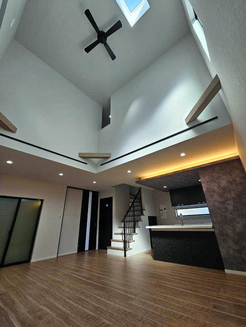 20帖のリビング上部には天窓、リーシングファン付の吹抜けを設置し、とても明るいリビングとなっています